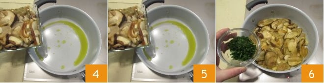 Ajoutez ensuite dans la poêle les cèpes que vous avez préalablement lavés et coupés en tranches 4 et faites-les cuire à feu vif pendant 6 minutes. Prenez ensuite le persil, rincez-le et hachez-le finement sur une planche à découper 5. Ajoutez ensuite le persil aux champignons en cours de cuisson 6. Salez et poivrez. À l'aide d'une cuillère en bois, mélangez bien les ingrédients. Puis éteignez le feu.