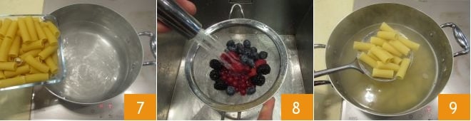 Prenez à ce stade une casserole et remplissez-la d'eau. Chauffez et quand l'eau bout, ajoutez le sel. Versez-y ensuite les rigatoni 7. Pendant que les rigatoni cuisent, prenez vos fruits des bois mélangés et rincez-les abondamment à l'eau 8. Lorsque les rigatoni sont al dente, égouttez-les à l'aide d'une écumoire, afin de ne pas jeter l'eau de cuisson des pâtes 9.