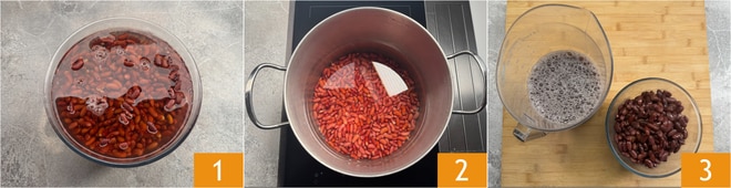 Pour préparer le riz et les haricots, commencez par faire tremper les haricots dans de l'eau froide pendant 8 heures, ou mieux encore toute la nuit 1. Rincez-les et transférez-les dans une casserole avec beaucoup d'eau froide non salée 2. Faites cuire pendant 1 heure à partir de l'ébullition. Égouttez et réservez séparément les haricots et leur bouillon de cuisson 3. Conservez ce dernier au chaud.