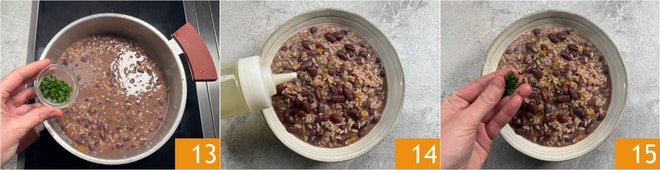Une fois la cuisson terminée, éteignez le feu, ajoutez le persil haché 13 et mélangez. Goûtez et, si nécessaire, ajustez l'assaisonnement avec du sel et du poivre. Servez le plat, complétez avec un filet d'huile d'olive à cru 14 et une pincée de persil haché 15. Votre riz et haricots est prêt à être dégusté!