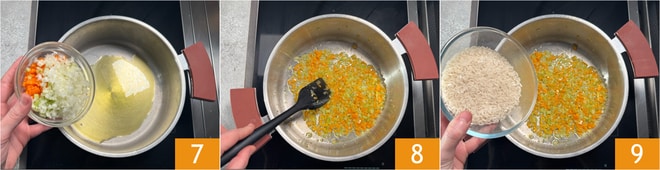 Dans une casserole, versez un filet d'huile, ajoutez les légumes 7 et faites mijoter à feu doux pendant environ 8 minutes, en remuant souvent 8. Ajoutez le riz et faites-le revenir pendant 2 minutes 9.