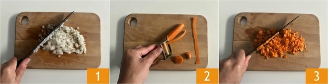 Pour préparer le riz aux lentilles, commencez par réaliser le bouillon de légumes et maintenez-le au chaud, puis passez à la préparation des lentilles, qui devront être cuites séparément avant d'être ajoutées au riz. Tout d'abord, épluchez et hachez finement l'oignon 1. Retirez les extrémités de la carotte et épluchez-la 2, puis hachez-la grossièrement 3.