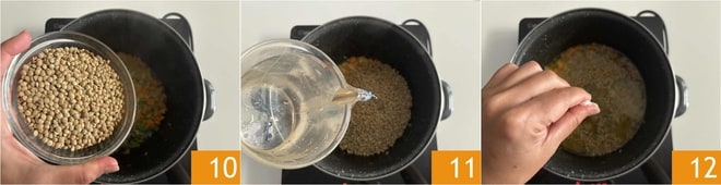 Ensuite, ajoutez les lentilles 10, l'eau 11 et le sel 12. Les lentilles ne doivent pas être trempées mais peuvent être rincées avant.