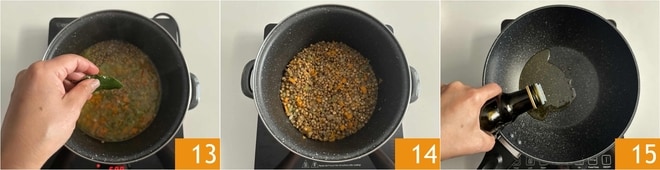 Ajoutez ensuite la feuille de laurier 13, mélangez bien le tout et faites cuire les lentilles à feu doux pendant environ 30 minutes 14. Une fois les lentilles prêtes, vous pouvez commencer à préparer le riz. Versez un filet d'huile d'olive extra vierge dans une casserole et faites chauffer 15.