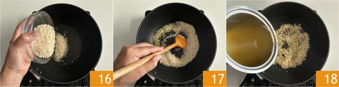À ce stade, ajoutez le riz 16 et faites-le griller quelques instants, en remuant avec une cuillère en bois 17. Puis mouillez avec une louche de bouillon de légumes 18.