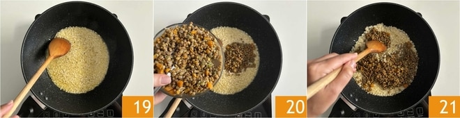 Continuez à cuire et ajoutez un peu de bouillon au fur et à mesure que cela sera nécessaire 19. À mi-cuisson, ajoutez les lentilles 20 et mélangez bien le tout 21.