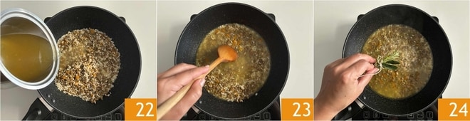 Mouillez encore avec le bouillon 22, continuez à mélanger 23 et ajoutez un bouquet d'aromates liés avec de la ficelle, nous avons utilisé une feuille de sauge, une de laurier et une branche de romarin 24.