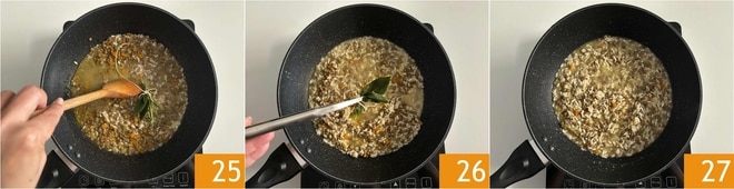 Continuez la cuisson, en ajoutant toujours le bouillon uniquement si nécessaire 25. Une fois la cuisson terminée, retirez les herbes aromatiques 26 et éteignez le feu 27.