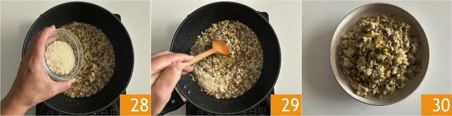 Enfin, ajoutez le Parmesan râpé 28 et mélangez le tout 29. Le riz aux lentilles est prêt, il ne vous reste plus qu'à le servir à table 30.