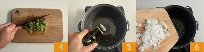 Il ne vous reste plus qu'à préparer le céleri, qui devra également être haché au couteau 4. Versez un filet d'huile d'olive extra vierge dans une casserole 5, ajoutez l'oignon 6.