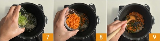 Ajoutez ensuite le céleri 7, la carotte 8 et faites-les revenir quelques minutes à feu doux 9.