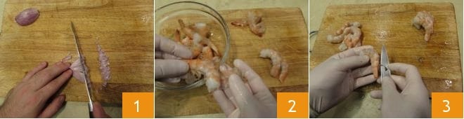 Pour préparer le risotto à l'encre de seiche et crevettes, commencez par préparer le bouillon de légumes et continuez en hachant finement l'échalote 1. Procédez ensuite au nettoyage du poisson : décortiquez les crevettes 2. Une fois nettoyées à l'extérieur, enlevez l'intestin en incisant le dos de la crevette et en le retirant délicatement avec un cure-dent en faisant bien attention à ne pas le casser 3. Mettez les crevettes de côté.