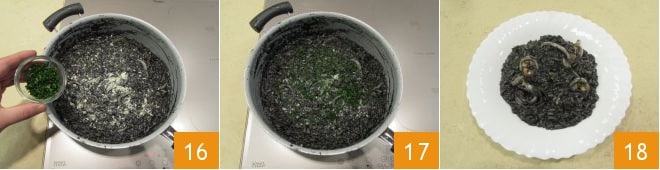 Saupoudrez avec le persil 16 et mélangez à nouveau bien tous les ingrédients jusqu'à ce qu'ils soient complètement amalgamés 17. Ensuite, dressez votre risotto à l'encre de seiche et crevettes 18 et apportez cette délice à table !
