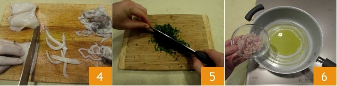 Prenez les petites seiches et coupez-les en fines lanières 4, en gardant les tentacules entiers qui, avec leurs formes enroulées, serviront à décorer le risotto. Lavez et séchez soigneusement le persil, puis hachez-le très finement 5. Maintenant, prenez une casserole avec un fond antiadhésif et des bords hauts dans laquelle vous ferez revenir l'échalote avec 50 g d'huile 6, en continuant de remuer.