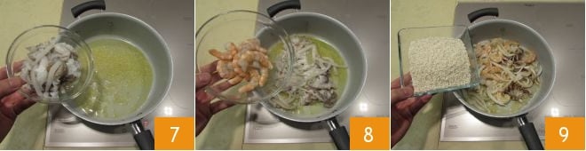 Après 5-6 minutes, elle sera bien dorée : ajoutez les petites seiches 7 ainsi que les crevettes dans la casserole 8 : faites cuire les poissons en les mélangeant continuellement pour qu'ils ne collent pas au fond de la casserole pendant environ 2 minutes à feu doux. Ensuite, ajoutez le riz 9 et laissez-le griller pendant encore 3 minutes en le remuant continuellement.