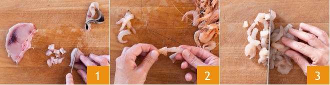 Pour réaliser le risotto à l'orange avec espadon et crevettes, commencez par vous occuper du poisson : nettoyez l'espadon en enlevant la peau et l'os central, puis coupez la chair en dés 1. Décortiquez les crevettes en enlevant la tête et la carapace 2, retirez le fil noir du dos et hachez la chair au couteau 3.