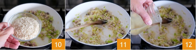 Maintenant, versez le riz 10 et faites-le griller à feu vif pendant quelques minutes, en remuant souvent 11. Déglacez avec le mousseux 12 et laissez évaporer complètement, puis baissez le feu et assaisonnez de sel et de poivre.