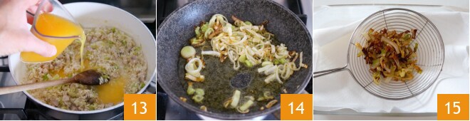 À ce stade, faites cuire le riz en ajoutant le jus d'orange petit à petit, en remuant souvent et en attendant que le liquide soit absorbé avant d'en ajouter plus 13. En attendant, chauffez beaucoup d'huile dans une autre poêle et faites frire les poireaux mis de côté 14, puis égouttez-les et transférez-les sur du papier absorbant pour enlever l'excès d'huile 15.