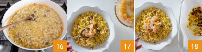 Quand le riz est cuit 16, éteignez le feu, versez un filet d'huile d'olive cru et laissez reposer quelques minutes. Dressez le risotto et complétez en ajoutant au centre de chaque assiette une cuillerée de crevettes marinées 17 et une poignée de poireaux frits 18.
