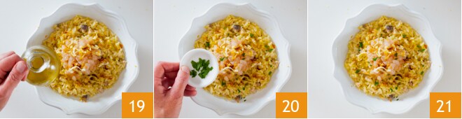 Assaisonnez d'un filet d'huile 19, garnissez de persil haché 20 et servez votre risotto à l'orange avec espadon et crevettes 21!