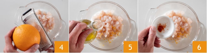 Transférez les crevettes dans un bol, ajoutez le zeste d'orange râpé 4, de l'huile 5, du sel et une pincée de piment 6. Mélangez bien, couvrez de film plastique et placez au réfrigérateur pour mariner pendant que vous continuez la recette.