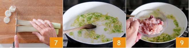 Maintenant, nettoyez les poireaux et coupez-les en rondelles 7, puis mettez-en environ 50 g de côté. Faites revenir le reste des poireaux dans une casserole où vous aurez fait chauffer un filet d'huile 8, puis ajoutez l'espadon 9 et laissez-le s'imprégner brièvement.
