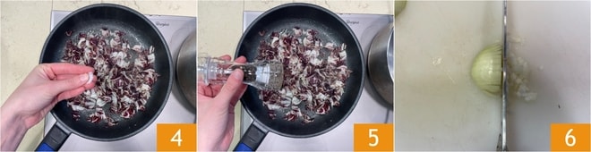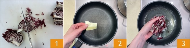 Pour préparer le risotto à la chicorée, vous devrez d'abord avoir le bouillon de légumes prêt et chaud. Ensuite, lavez et coupez la chicorée en fines lanières (gardez-en une poignée crue pour décorer les assiettes) 1. Dans une poêle, faites fondre 20 g de beurre 2 et ajoutez le reste de la chicorée 3.
