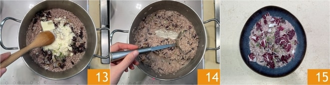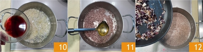 Lorsqu'il est grillé, déglacez avec le vin rouge 10, laissez l'alcool s'évaporer, puis commencez à mouiller avec le bouillon de légumes chaud 11 petit à petit, en ajoutant si nécessaire, pour cuire le risotto. À la fin de la cuisson, ajoutez la chicorée que vous aviez fait flétrir 12.