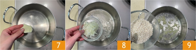 Dans une autre casserole, faites fondre 20 g de beurre supplémentaires 7, ajoutez l'oignon haché 8 et laissez mijoter en remuant souvent jusqu'à ce qu'il devienne tendre. Versez le riz 9 et faites-le griller quelques minutes dans la casserole en remuant.