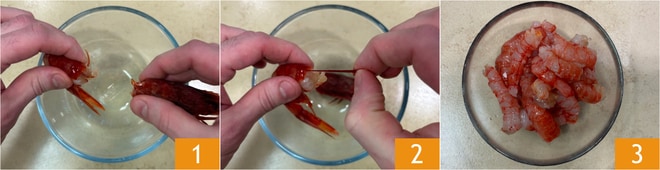 Pour préparer le risotto avec crème de courgettes et crevettes crues, commencez par nettoyer les crevettes. Enlevez la tête 1 et l'intestin 2, puis retirez la carapace 3 et mettez-les de côté. Conservez les têtes et les carapaces, elles serviront pour préparer le fumet de poisson.