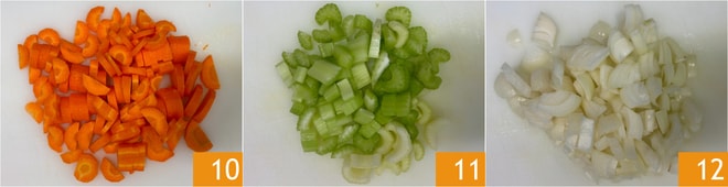 Épluchez et coupez en petits morceaux les carottes 10, le céleri 11 et l'oignon 12.