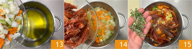 Chauffez l'huile dans une casserole, ajoutez le mélange de légumes 13, les restes de crevettes 14 et la marjolaine 15.