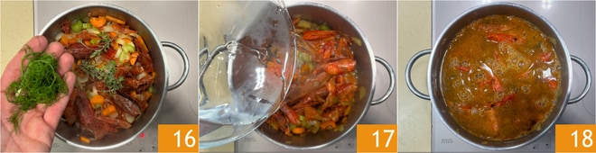Ajoutez également l'aneth 16 et faites revenir quelques minutes. Couvrez ensuite d'eau froide 17 et faites cuire pendant 30 minutes 18.