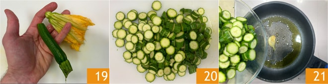 Entre-temps, séparez les courgettes des fleurs 19 et coupez-les en rondelles 20. Dans une poêle, versez l'huile, ajoutez une gousse d'ail et faites revenir quelques minutes, puis ajoutez les courgettes 21.