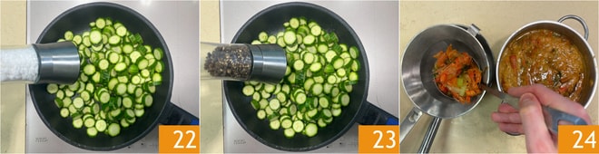 Ajustez le sel 22 et le poivre 23 et faites sauter pendant quelques minutes. Une fois le bouillon cuit, filtrez-le 24.