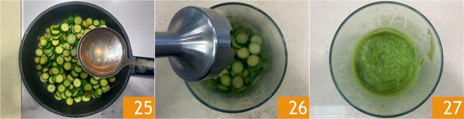 Ajoutez aux courgettes une louche de bouillon 25 et faites cuire pendant quelques minutes, juste le temps d'assaisonner les courgettes. Retirez l'ail et transférez le tout dans un mixeur 26, puis mixez jusqu'à obtenir une crème lisse et homogène 27. Mettez de côté.