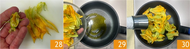 Nettoyez les fleurs de courgette 28, mettez-les dans une poêle avec un filet d'huile 29 et ajustez le sel 30.