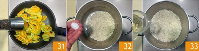 Ajoutez le poivre 31 et faites sauter pendant quelques minutes, mettez de côté. Maintenant, consacrez-vous à la cuisson du riz : versez le riz dans une casserole, ajoutez le sel 32 et faites-le griller à sec pendant quelques minutes à feu doux. Déglacez avec le vin blanc 33.