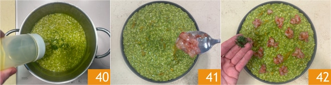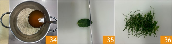 Augmentez le feu et faites évaporer toute la partie alcoolique du vin, puis mouillez avec le bouillon 34 et faites cuire le riz, en ajoutant une louche de bouillon à chaque fois que le précédent a été absorbé. Entre-temps, coupez la menthe 35 en fines lamelles 36.