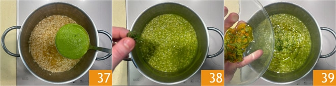 Quand il reste 2 minutes avant la fin de la cuisson du riz, ajoutez la crème de courgettes 37 et éteignez le feu. Ajoutez la menthe 38 et les fleurs de courgette 39.