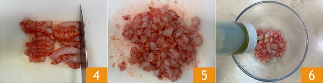 Coupez les crevettes 4 en petits morceaux 5, puis transférez-les dans un bol et assaisonnez d'un filet d'huile 6.