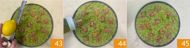 Complétez avec le zeste de citron râpé 43 et un filet d'huile d'olive à cru 44. Le risotto avec crème de courgettes et crevettes crues est prêt à être servi 45 !