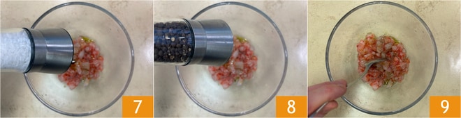 Ajustez le sel 7 et le poivre 8. Mélangez 9 et mettez de côté.