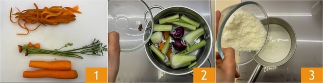Pour préparer le risotto à la crème de potiron et pecorino, commencez par nettoyer la carotte, le céleri et l'oignon pour le bouillon 1. Mettez les légumes dans une grande casserole, couvrez d'eau et assaisonnez avec des grains de poivre et des clous de girofle 2. Allumez le feu et faites cuire pendant environ 45 minutes. Pendant ce temps, préparez la crème de Pecorino : dans une petite casserole, versez la crème, le pecorino 3 et le Parmigiano Reggiano DOP râpés.