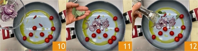Continuez avec l'oignon 10 et la sauge 11, salez et poivrez 12. Laissez revenir à feu modéré.