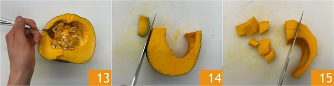 Nettoyez le potiron : enlevez les graines 13, retirez la peau 14 et découpez-le en dés 15.