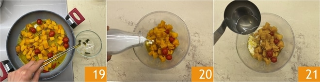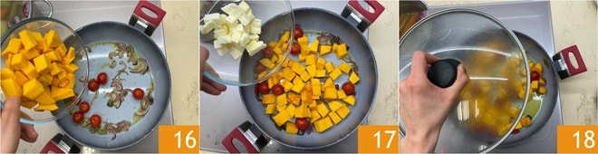 Ajoutez le potiron 16 et le beurre 17, assaisonnez de sel et couvrez avec le couvercle 18. Faites cuire pendant environ 20 minutes à feu doux.