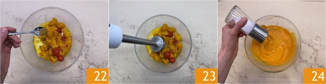 Assaisonnez avec le curry 22 et mixez avec le mixeur plongeant 23, puis ajustez le sel 24.