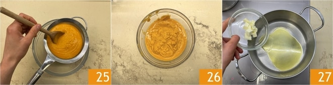 Tamisez la crème à travers un tamis 25 pour la rendre plus lisse 26 ; si vous préférez, vous pouvez omettre cette étape. Préparez le riz : dans une casserole, faites fondre le beurre et l'huile 27.
