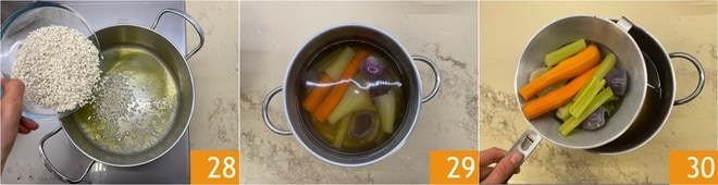 Ajoutez le riz, salez et laissez le griller jusqu'à ce que les grains soient bien chauds 28. Pendant ce temps, récupérez le bouillon que vous avez préparé 29 et filtrez-le 30.
